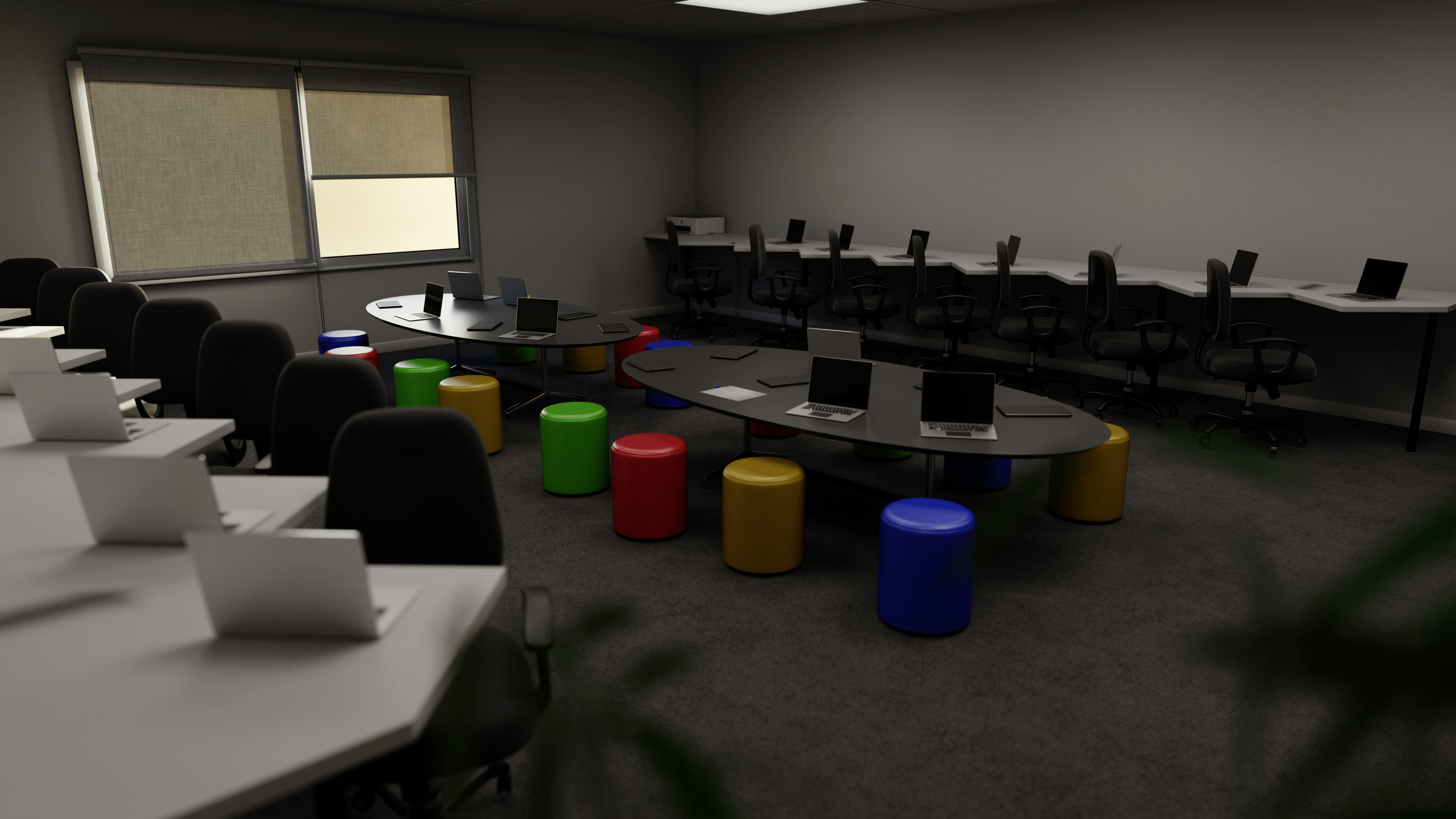 The ICT renovation project emphasises a modern and functional design, blending sleek materials and a bright, open layout to enhance usability. Bespoke assets were carefully modelled for furniture, lighting fixtures, and decor to maintain consistency and efficiency. The scene's lighting setup was meticulously crafted, using a combination of HDRI for natural ambient light and strategically placed artificial sources to highlight key architectural features and create a welcoming atmosphere.
